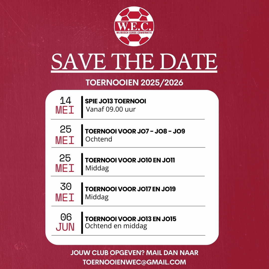 | 30 mei 2026 | Toernooi | WEC | Wijbosch | link | JO17+JO19 | link | |